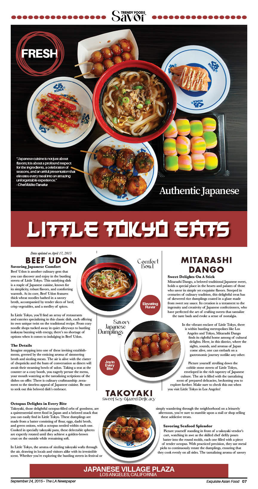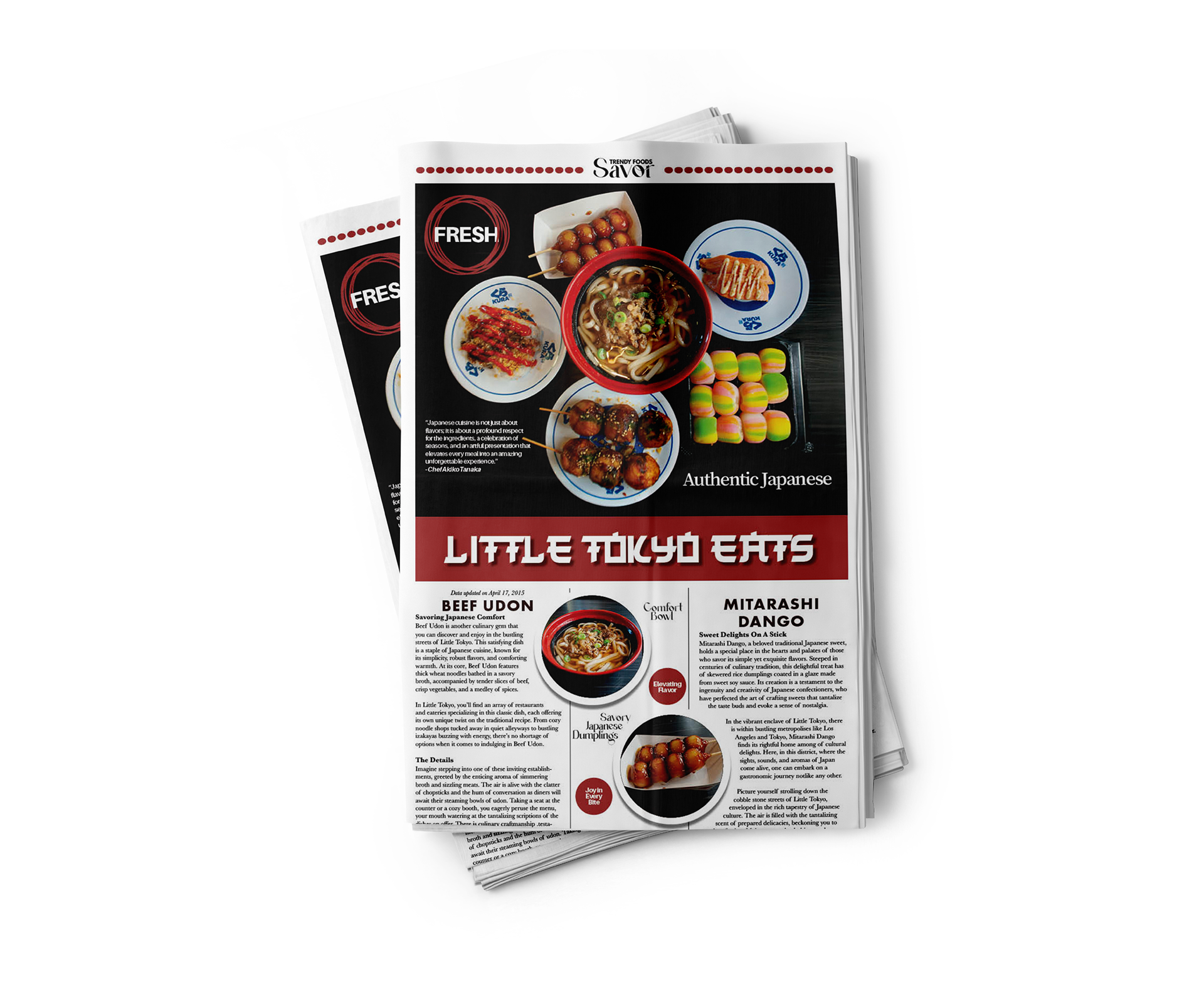 I paired a bold, stylized display font for the “Little Tokyo Eats” headline with clean serif and sans-serif fonts for body text and subheads. This contrast kept things visually interesting while staying legible.