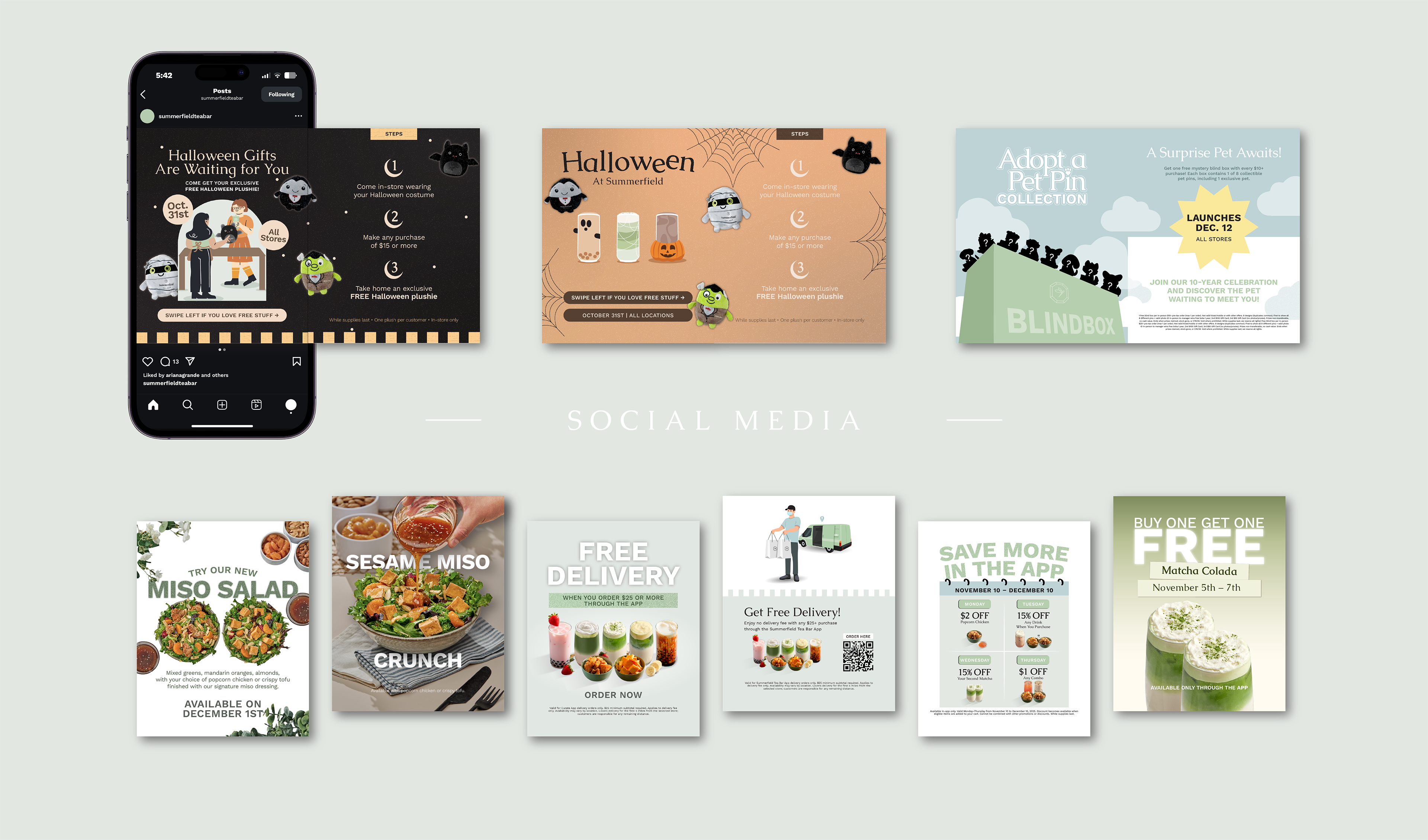 I designed a range of Instagram posts and promotional graphics to support product launches, seasonal campaigns, and in-store events. These designs balance playful visuals with clear information, using strong hierarchy and brand colors to ensure readability on mobile devices. Content was created to be visually engaging while remaining consistent with Summerfield Tea Bar’s overall brand identity.