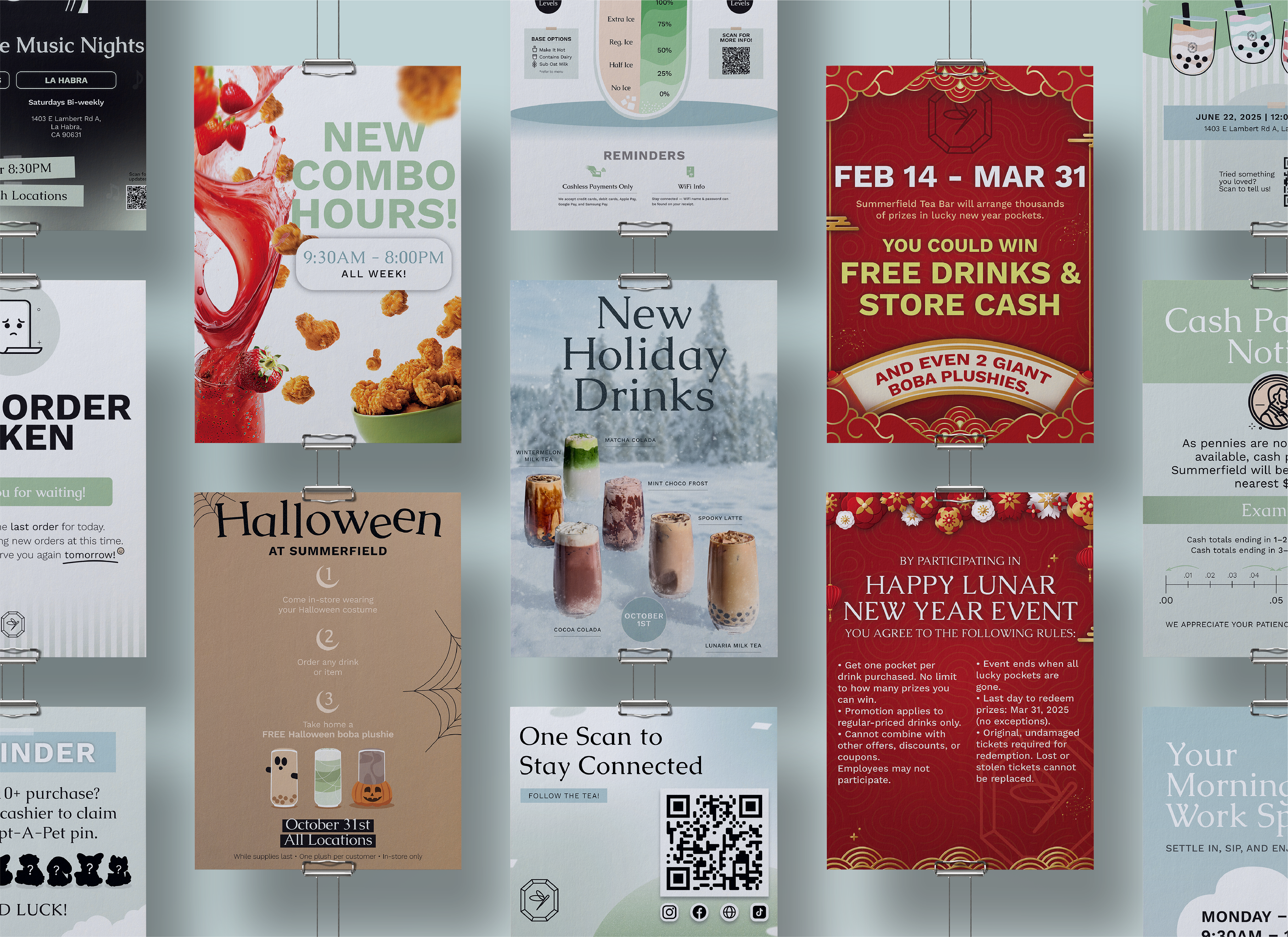 I designed a range of in-store signage to support promotions, events, and day-to-day communication across Summerfield Tea Bar locations. These graphics were created to be easily readable at a distance while maintaining consistency with the brand’s visual system. Each sign balances bold typography with supporting imagery to clearly communicate key information in a busy retail environment.