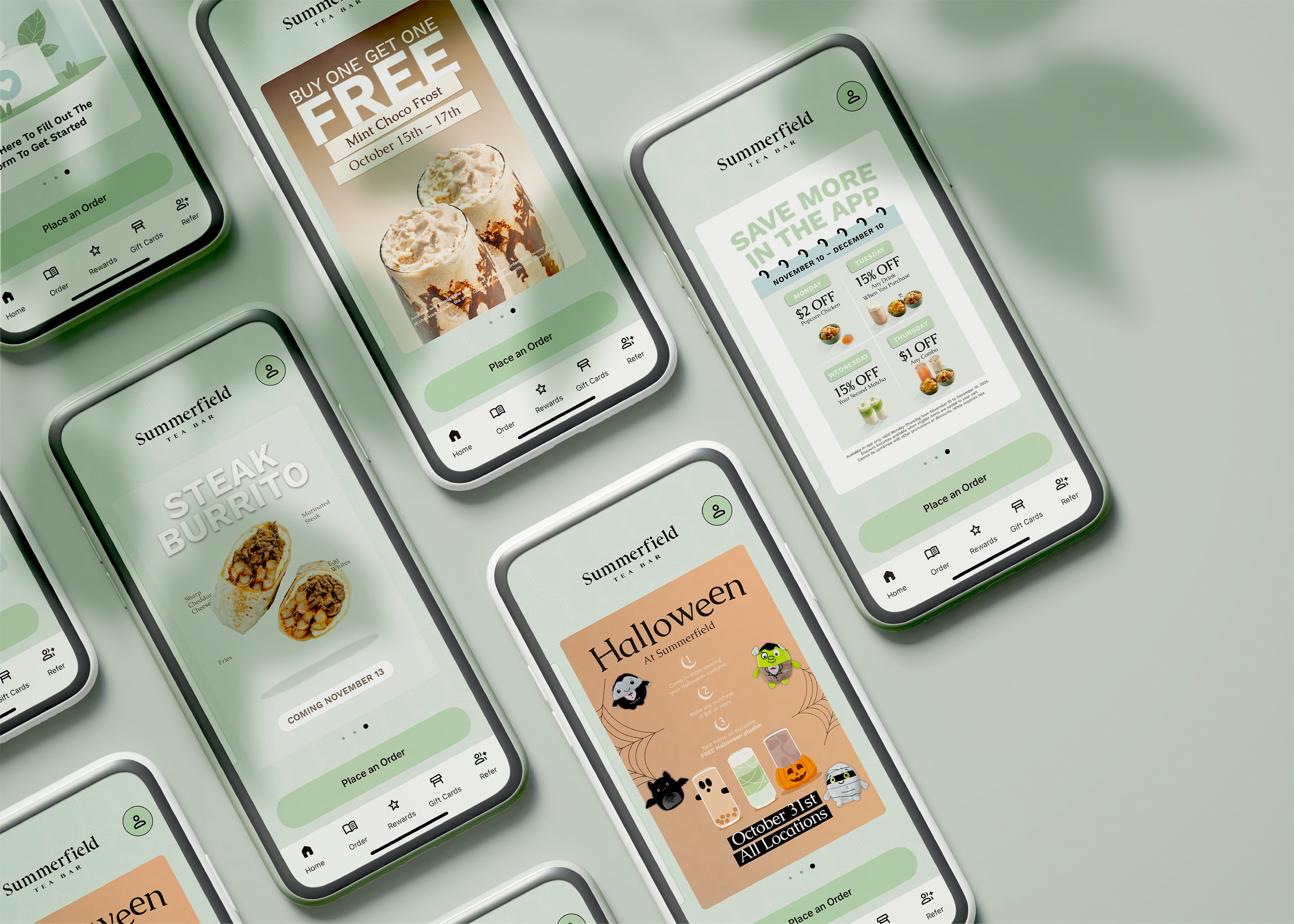 I designed promotional app cards to highlight limited-time offers, seasonal campaigns, and app-exclusive deals within the Summerfield Tea Bar mobile app. These designs were created to be visually consistent with the brand while prioritizing clarity and usability on small screens.